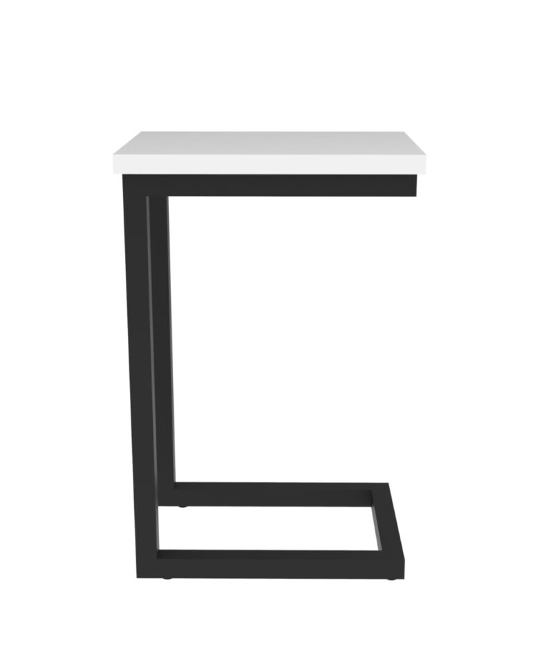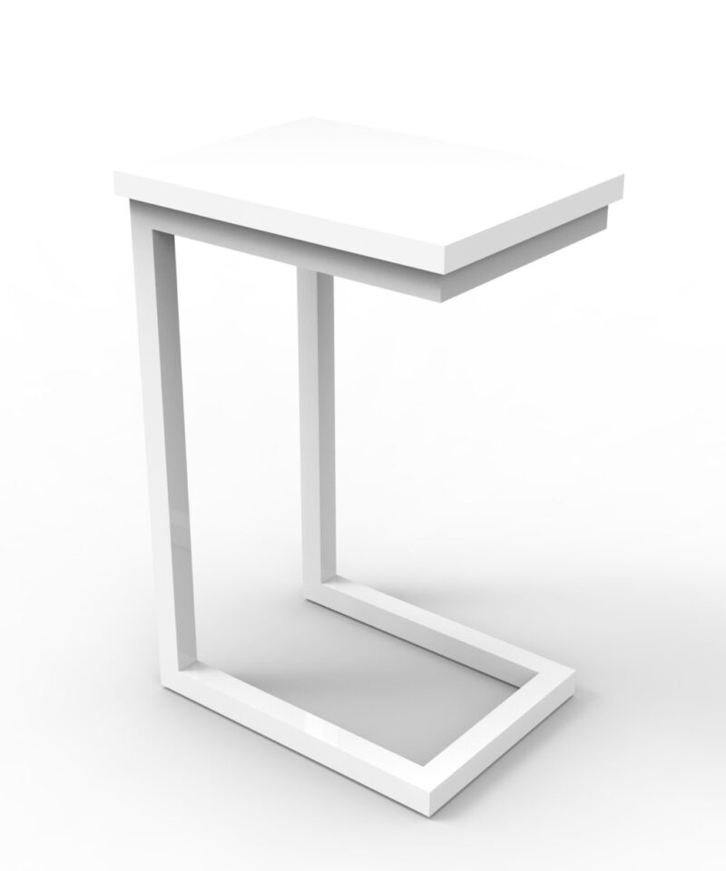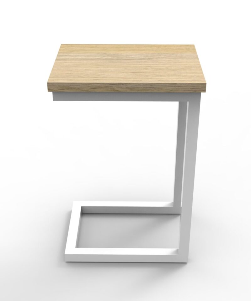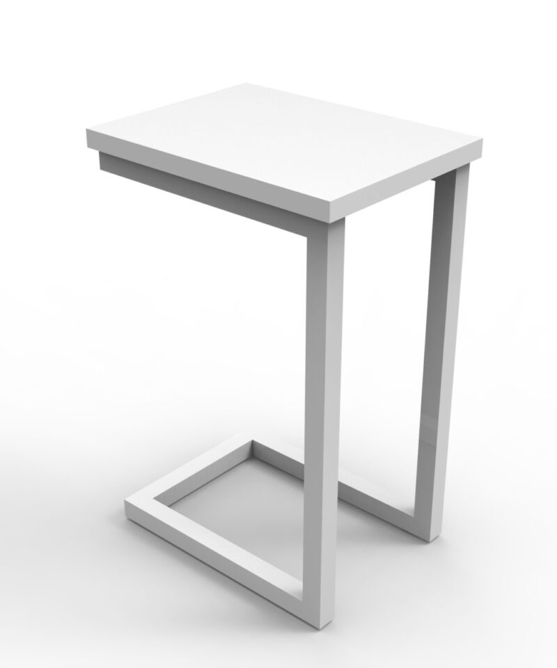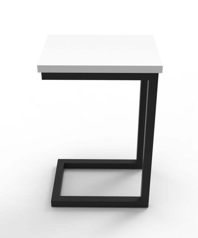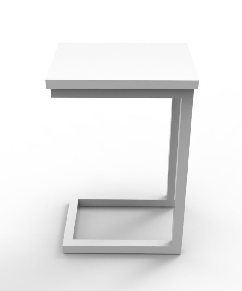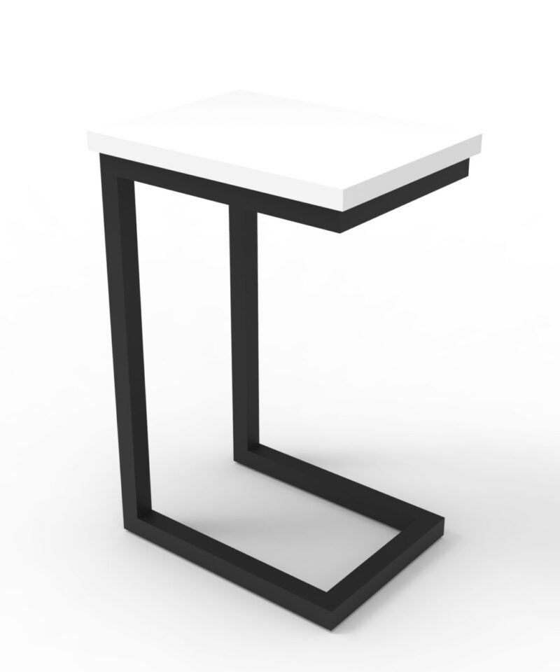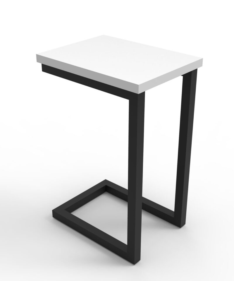 The Eternity side table features a powdercoat cantilever frame in black or white that slides conveniently under lounges or sofas.