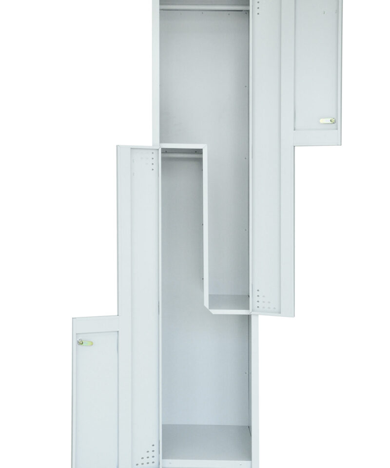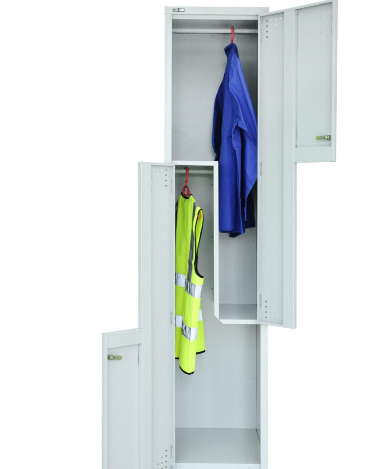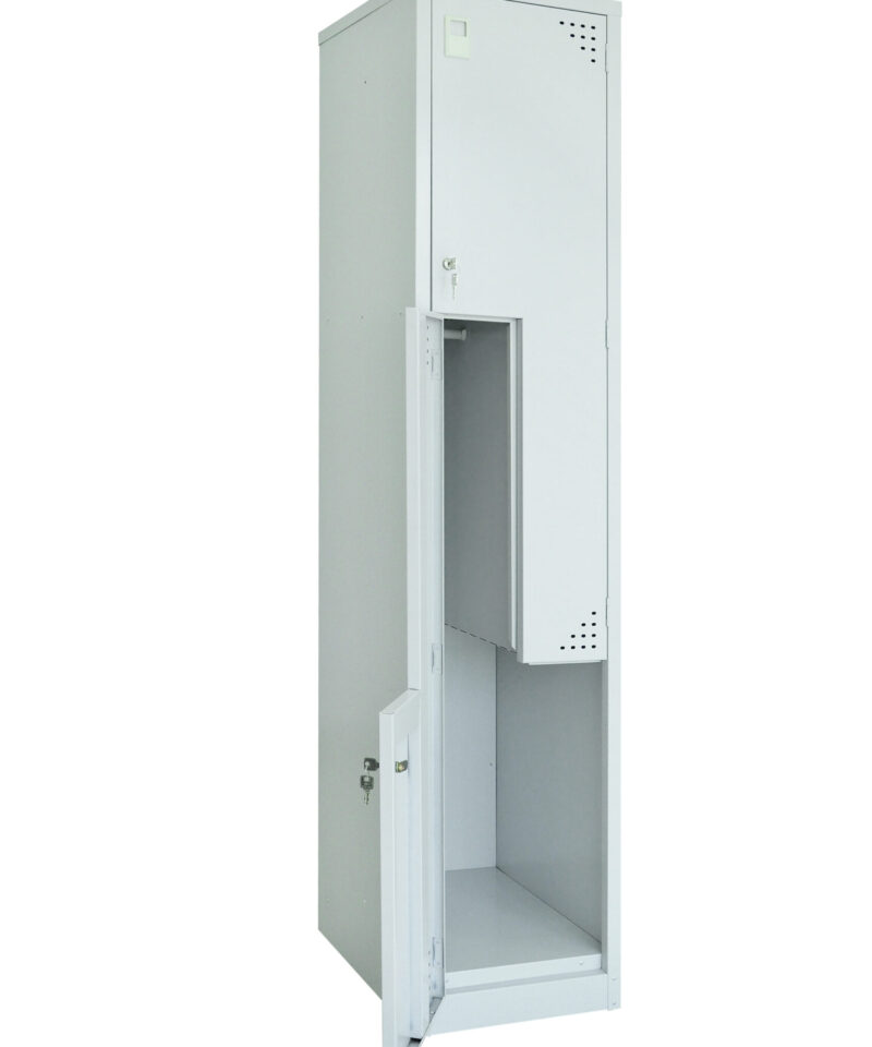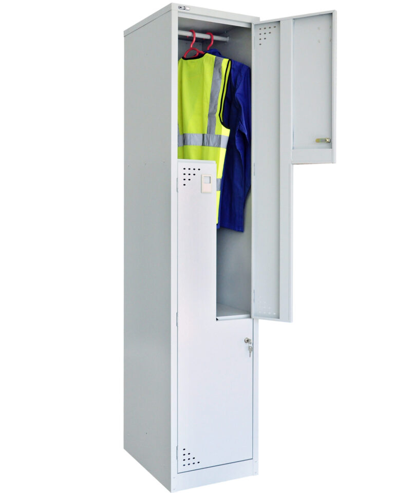 The Step locker allows for 2 hanging compartments in one unit, saving valuable space. Locking doors with full-length door stiffeners and fully riveted construction for extra strength.