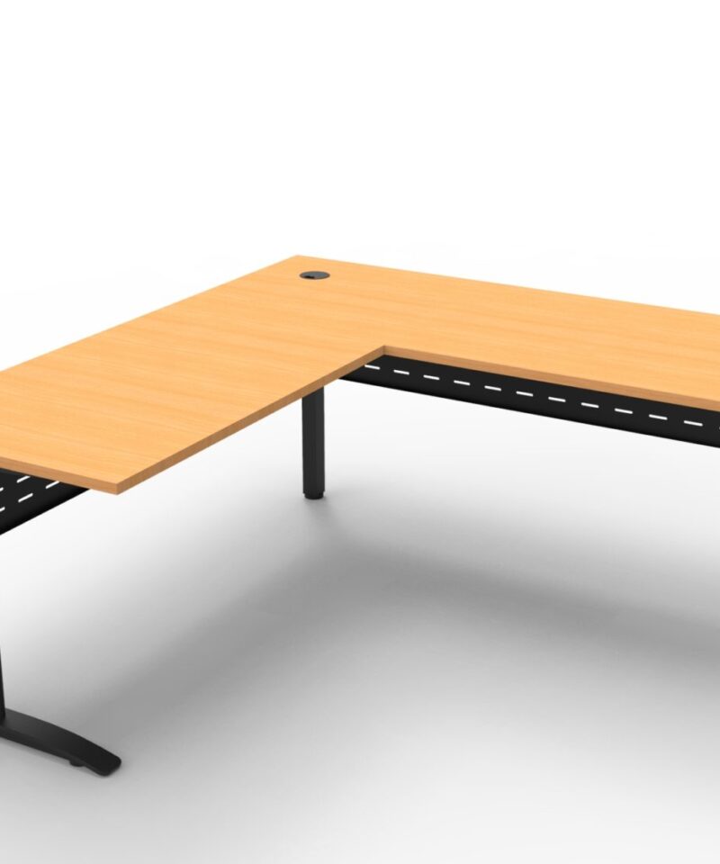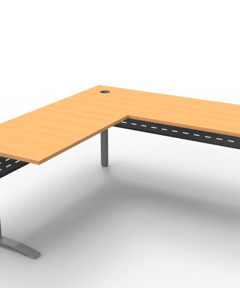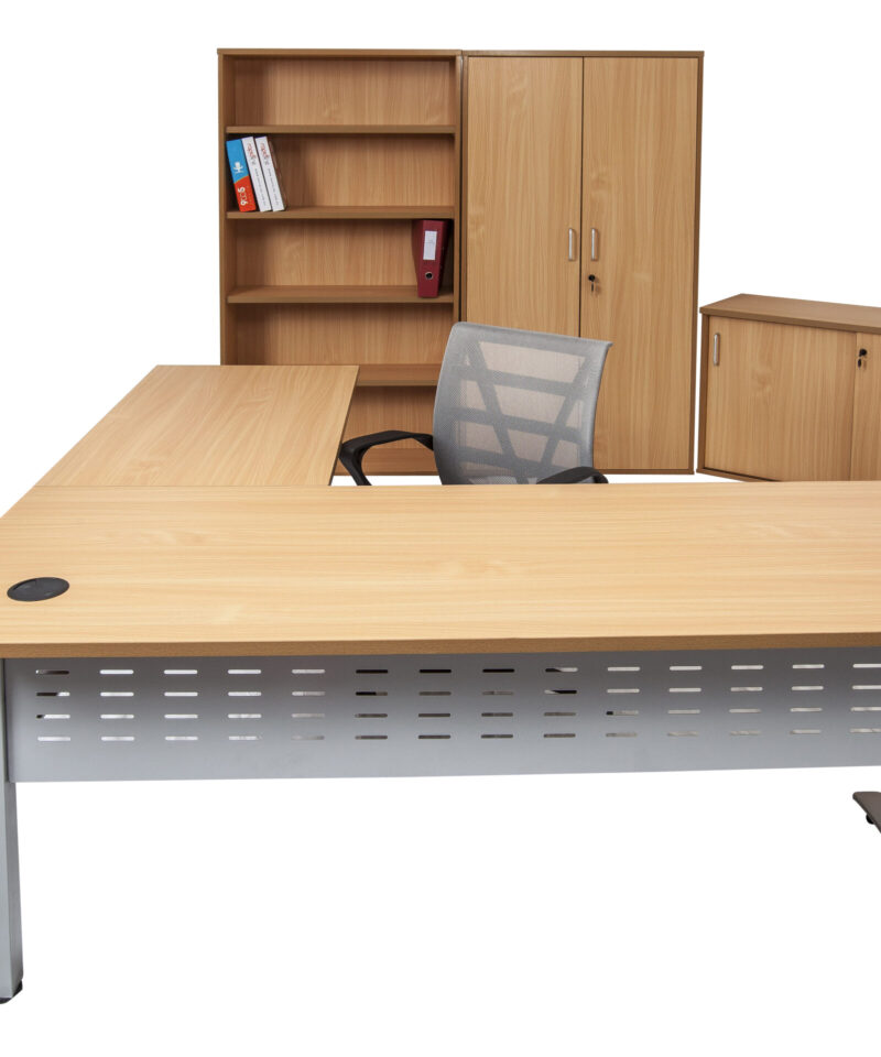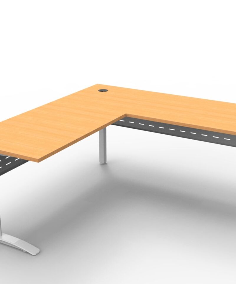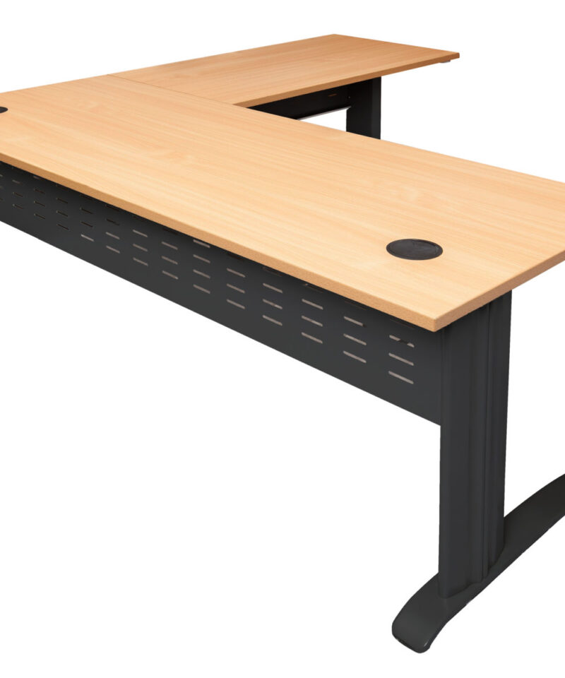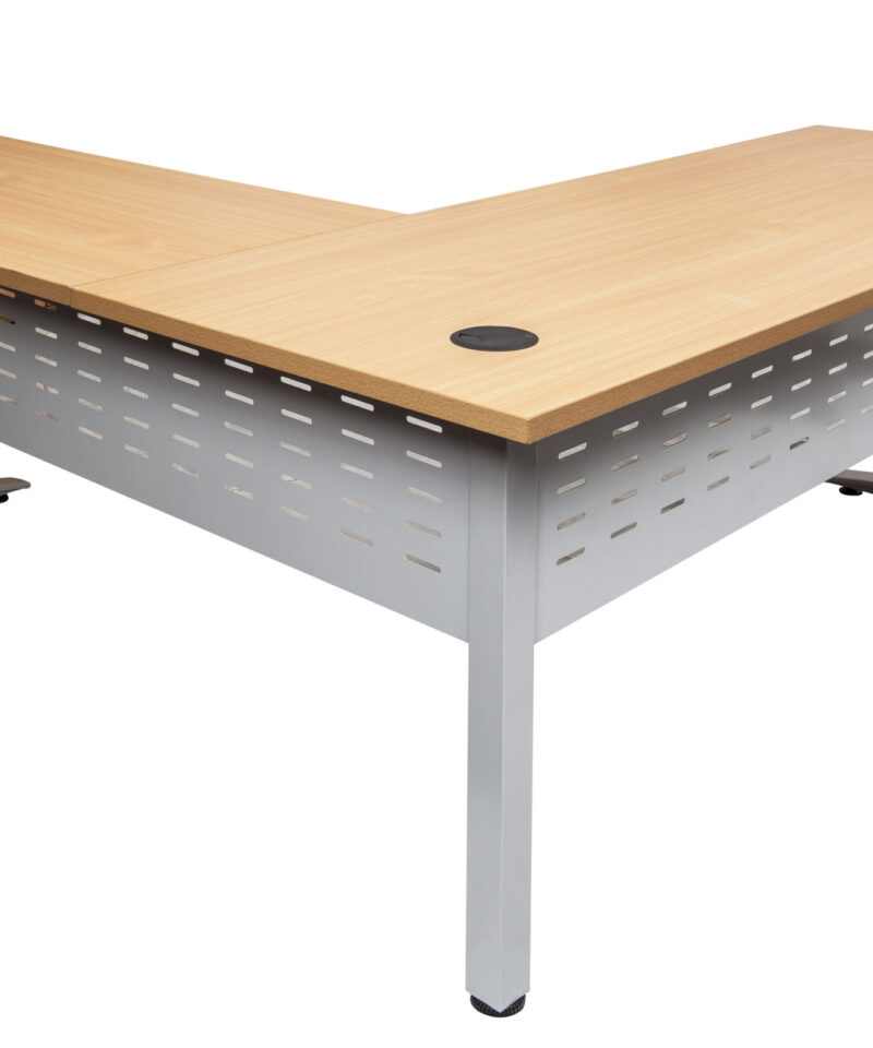 The desk and return allows ample work space, ideal for a stand alone desk, with an E0 top with cable tidy, perforated metal modesty and adjustable feet.
