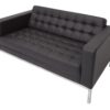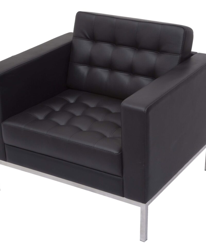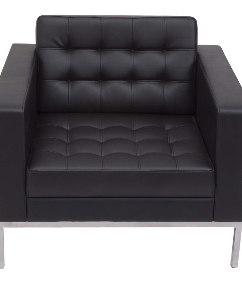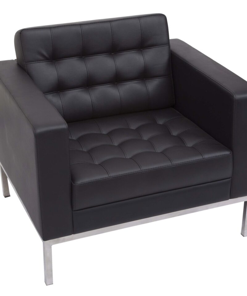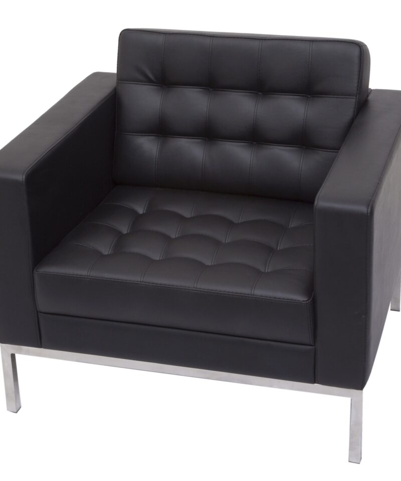 Elegant reception area arm chair with button finish to black PU, easy clean upholstery. Stainless steel underframe and legs.